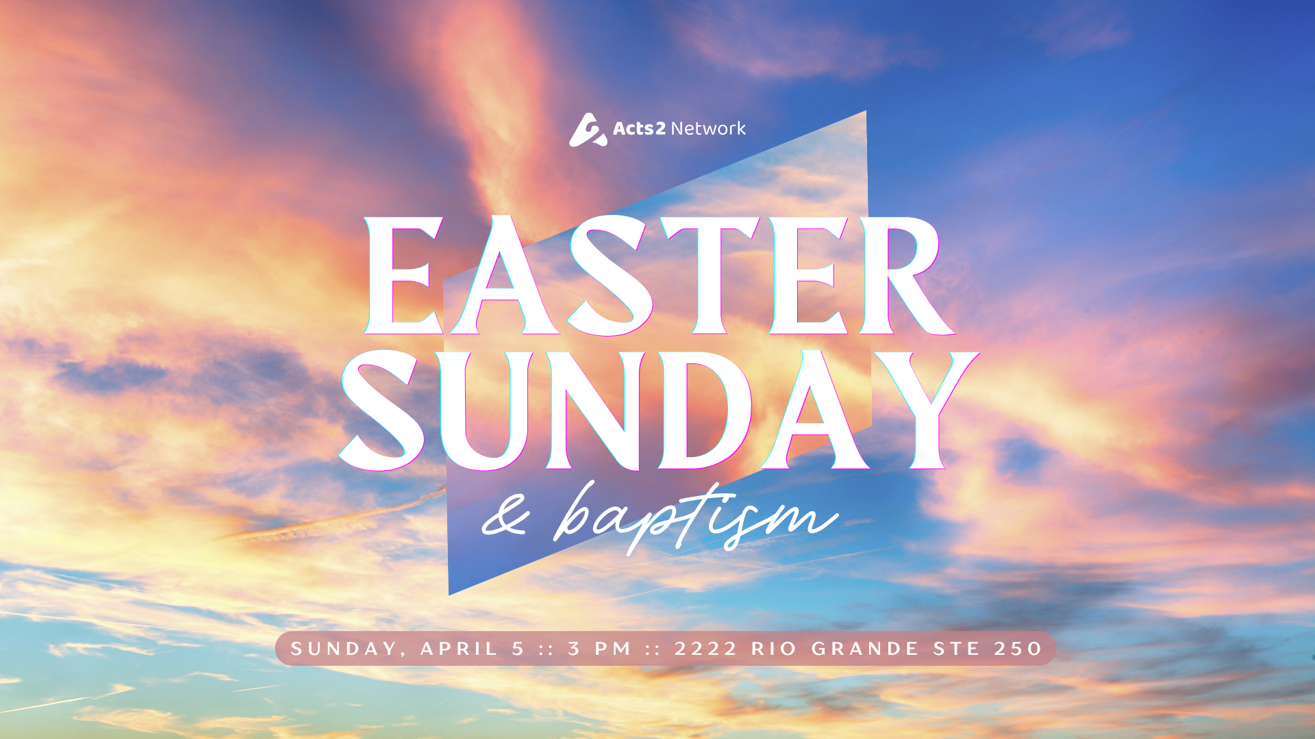Easter Sunday Worship Service Sunday, April 5, 2026 3:00 PM 4:30 PM Acts2 Network RIO 2222 Rio Grande Street Suite 250 Austin, TX, 78705 United States (map) Google Calendar ICS HE IS RISEN! Celebrate Jesus’ victory over sin and death this Sunday, 3-4:30 PM at 2222 Rio Grande St, Suite 250, and join us for our annual Easter picnic afterward!